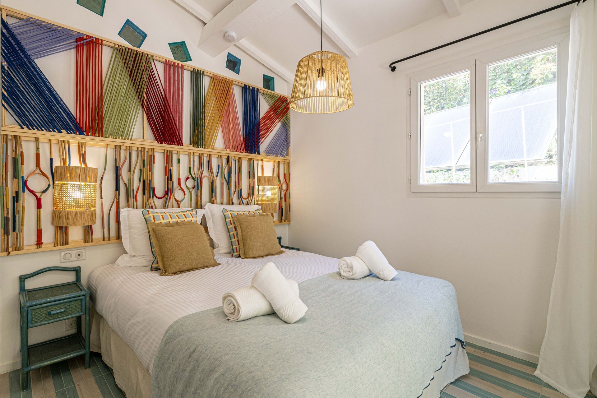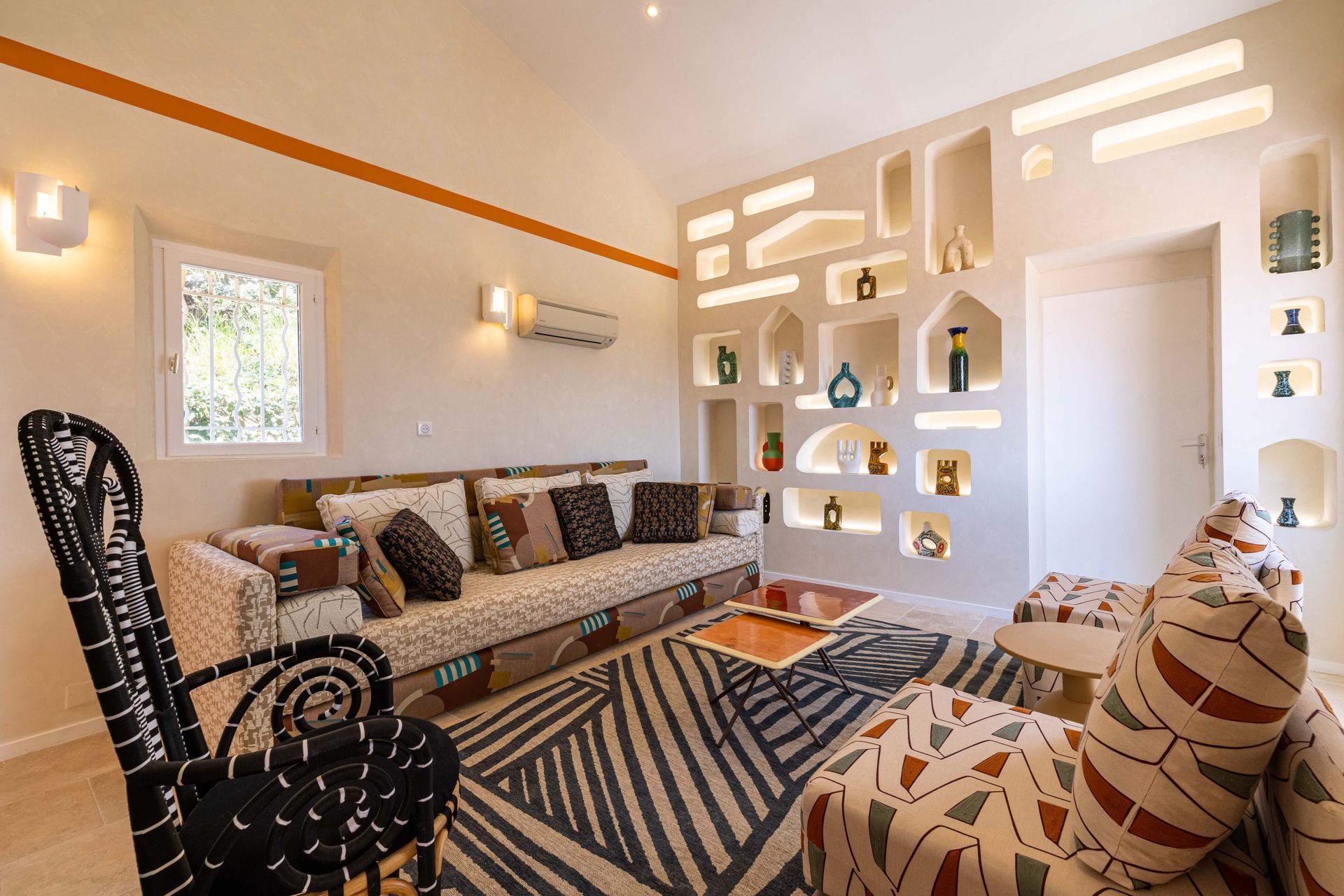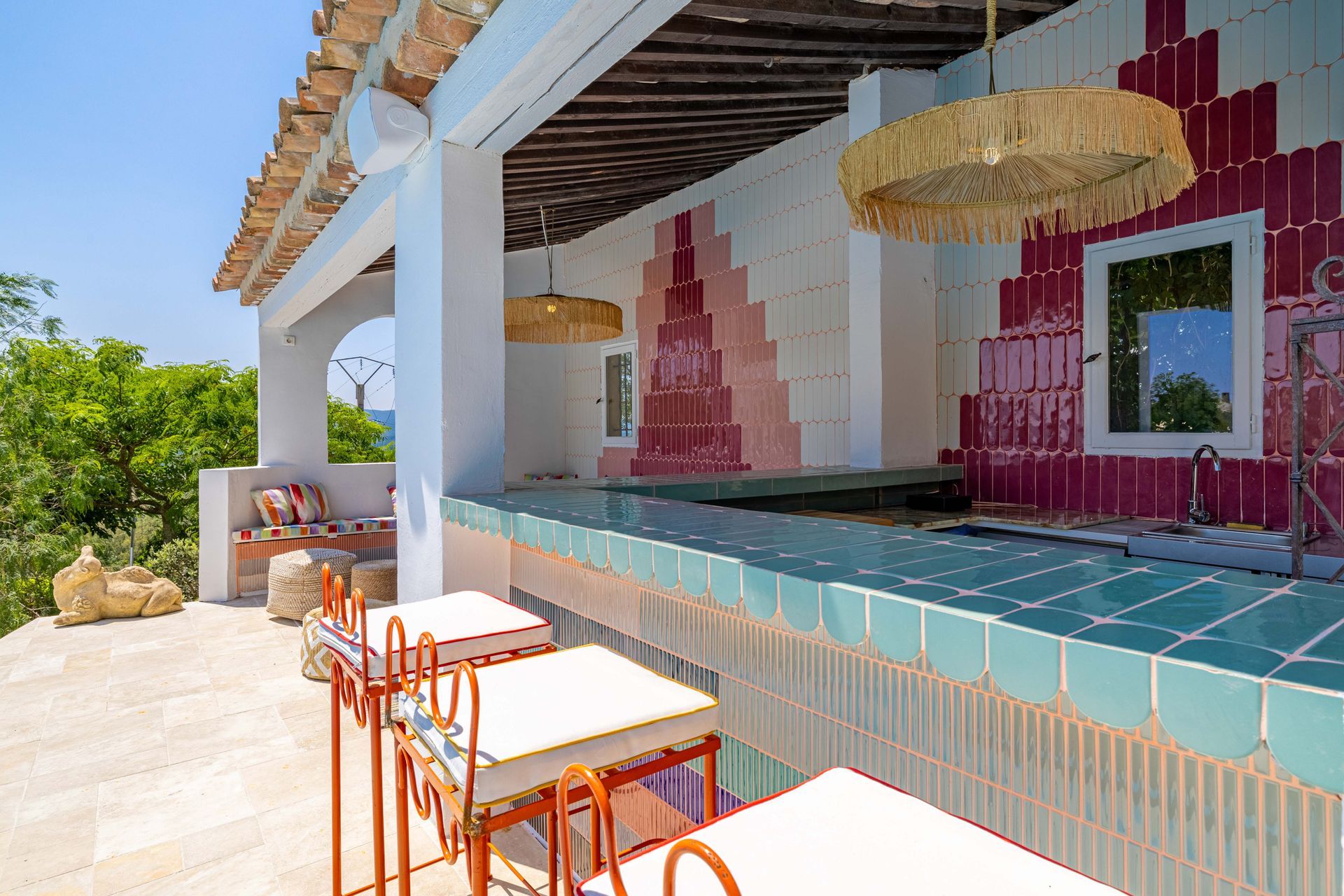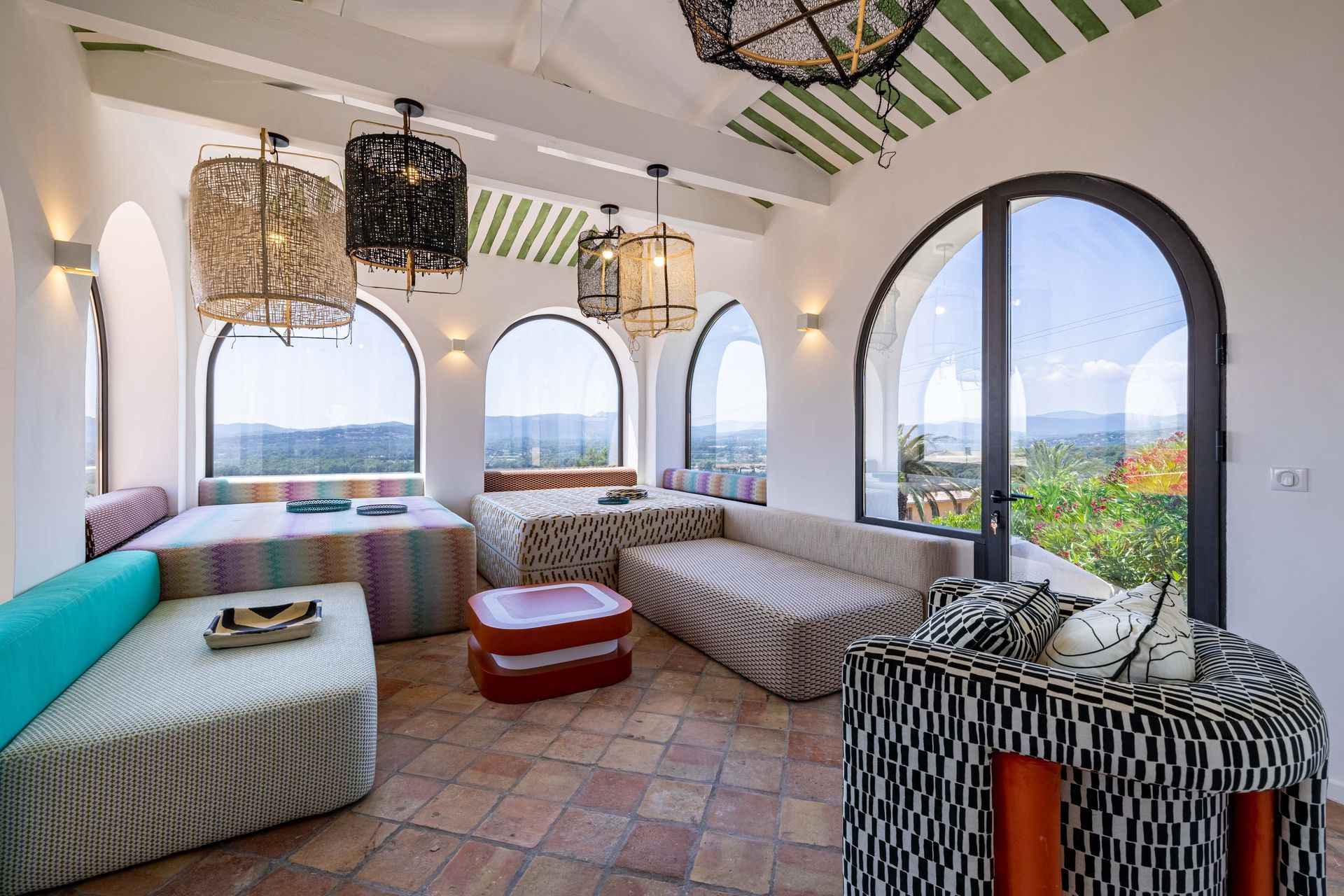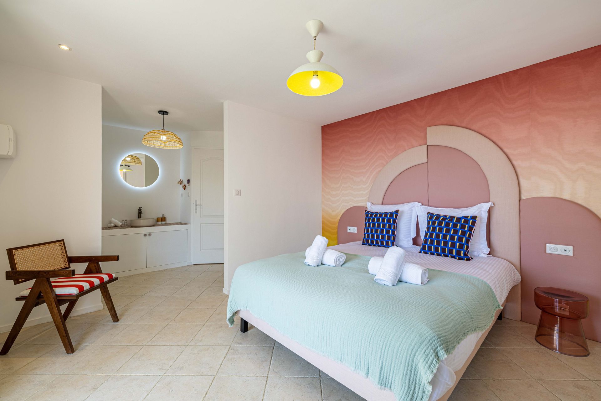 Located in the picturesque village of Grimaud, The Villa boasts modern architecture and colorful decor. Its privileged location offers spectacular views of the sea and the village, while preserving an intimate and tranquil atmosphere. A harmonious blend of contemporary design, clean lines and natural touches, it embodies all the charm of the Mediterranean.
